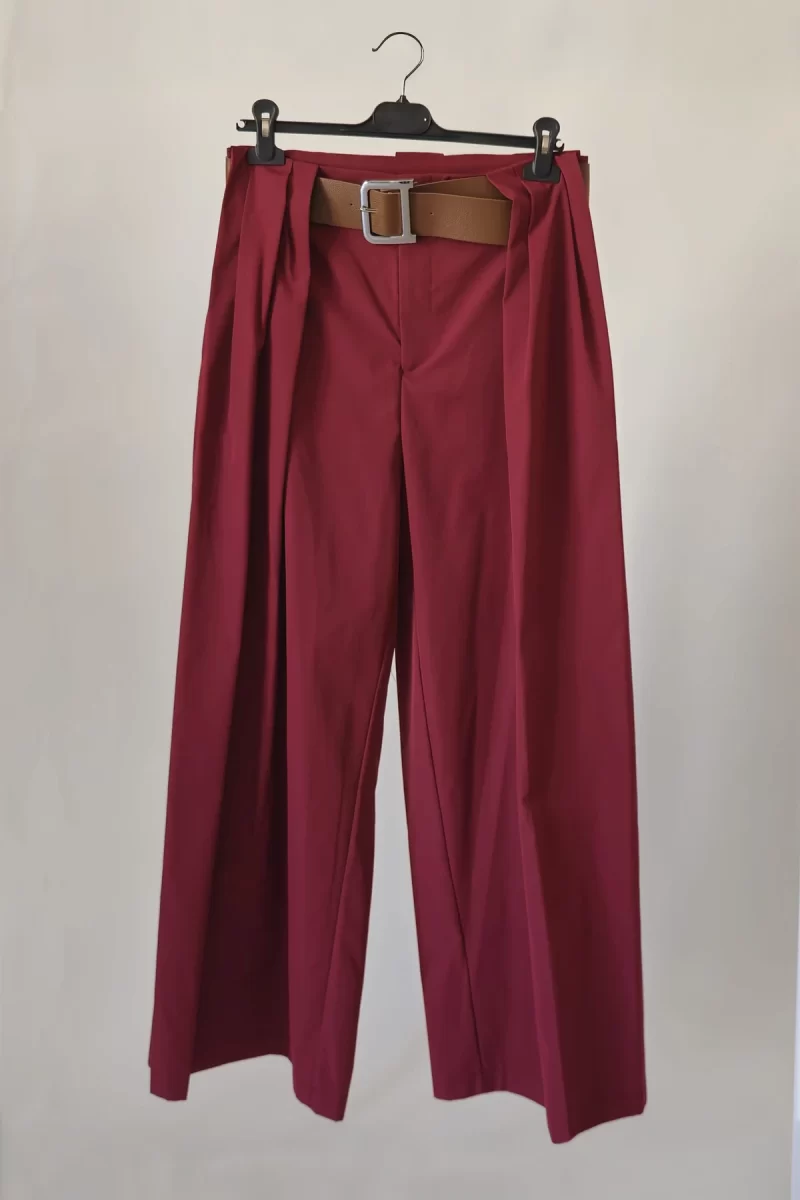 Pantaloni a gamba larga in tessuto satinato con pinces.Presenta passanti e due tasche. Chiusura anteriore con zip e gancio. Fit morbido.