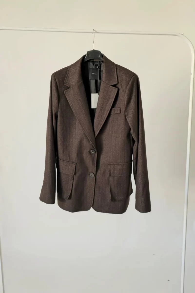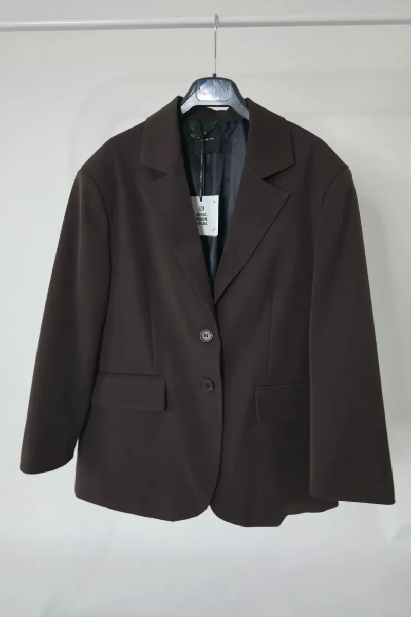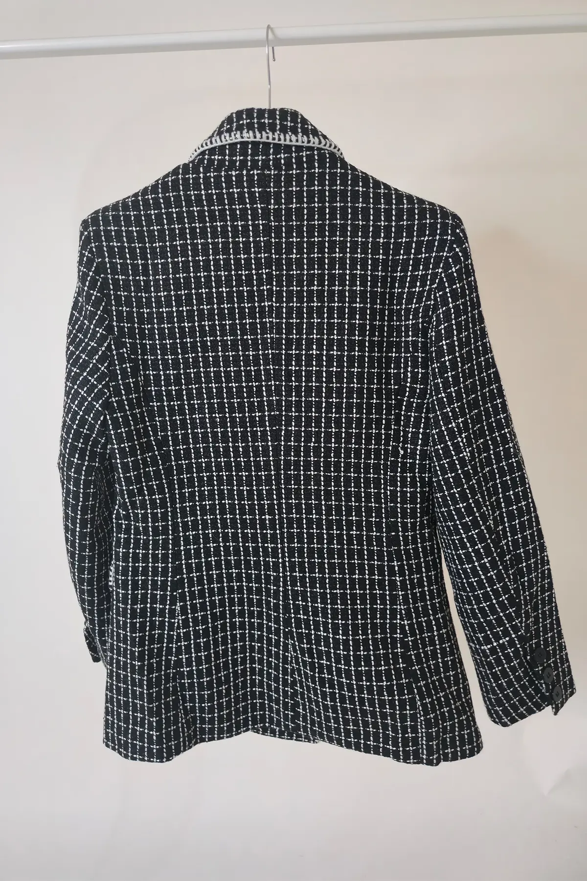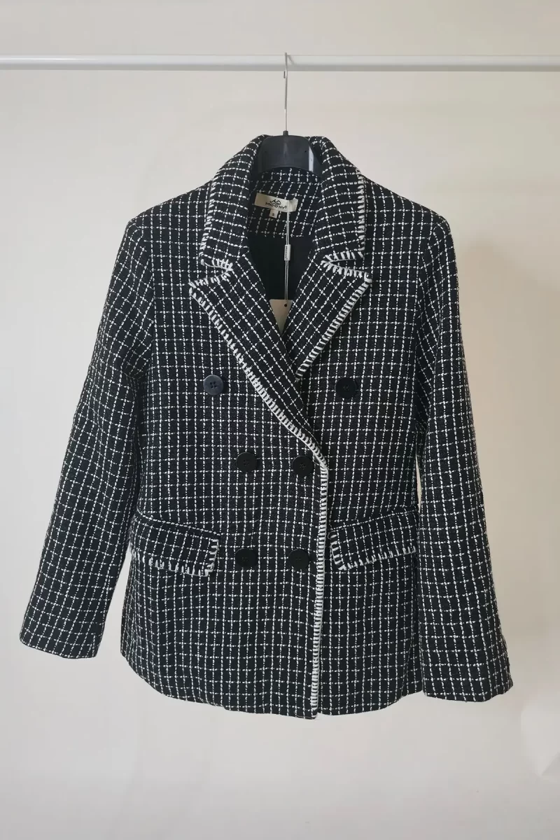 Giacca stile blazer con maniche lunghe e colletto a revers.Presenta due tasche con patta.Chiusura centrale tramite bottoni.Dettaglio di tessuto in pied-de-poule. Vestibilità oversize. Disponibile in taglia UNICA.