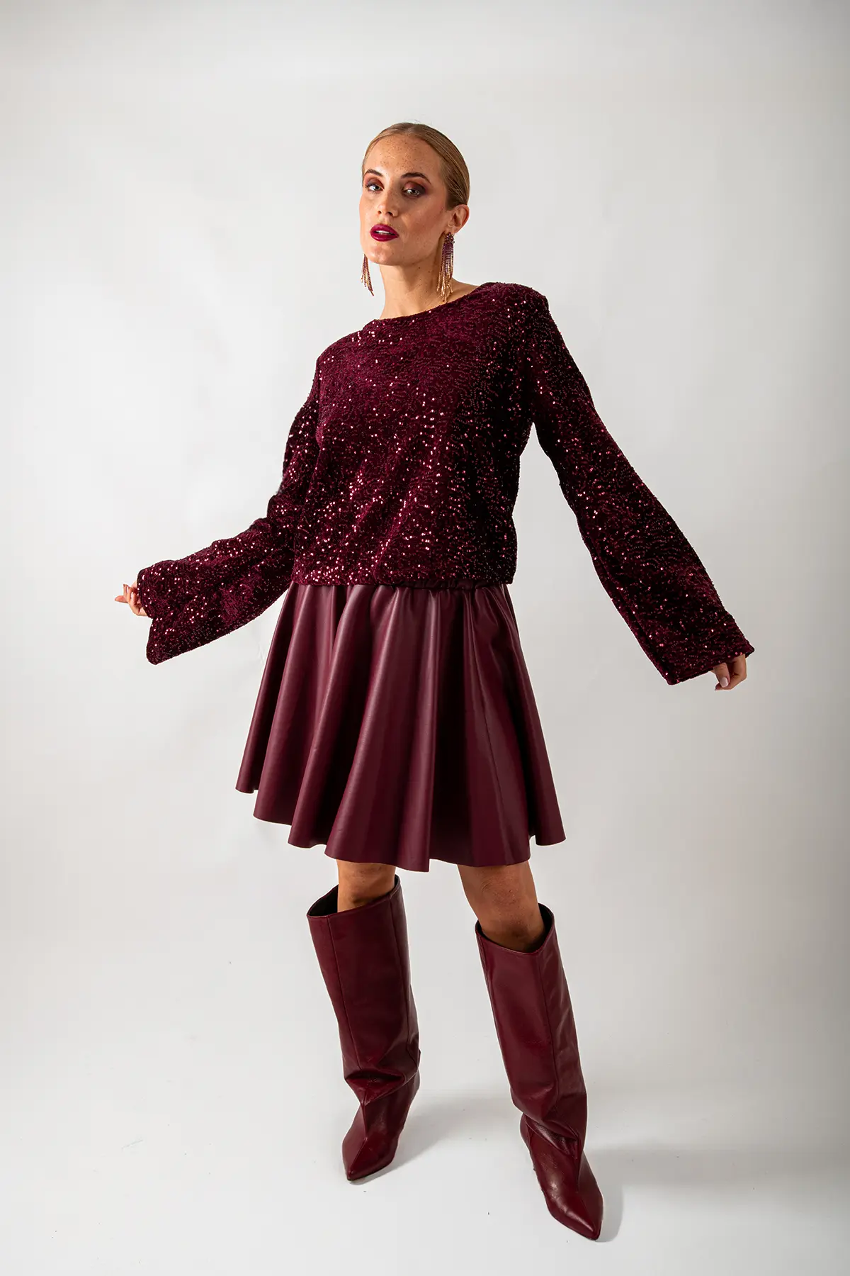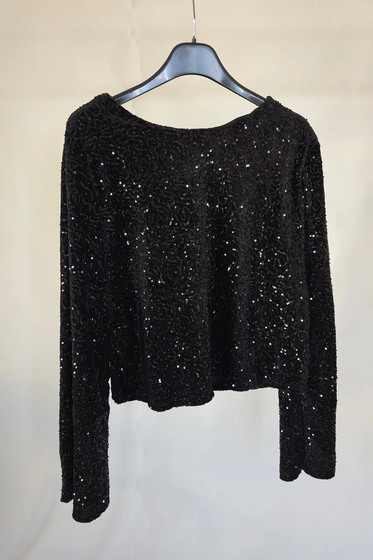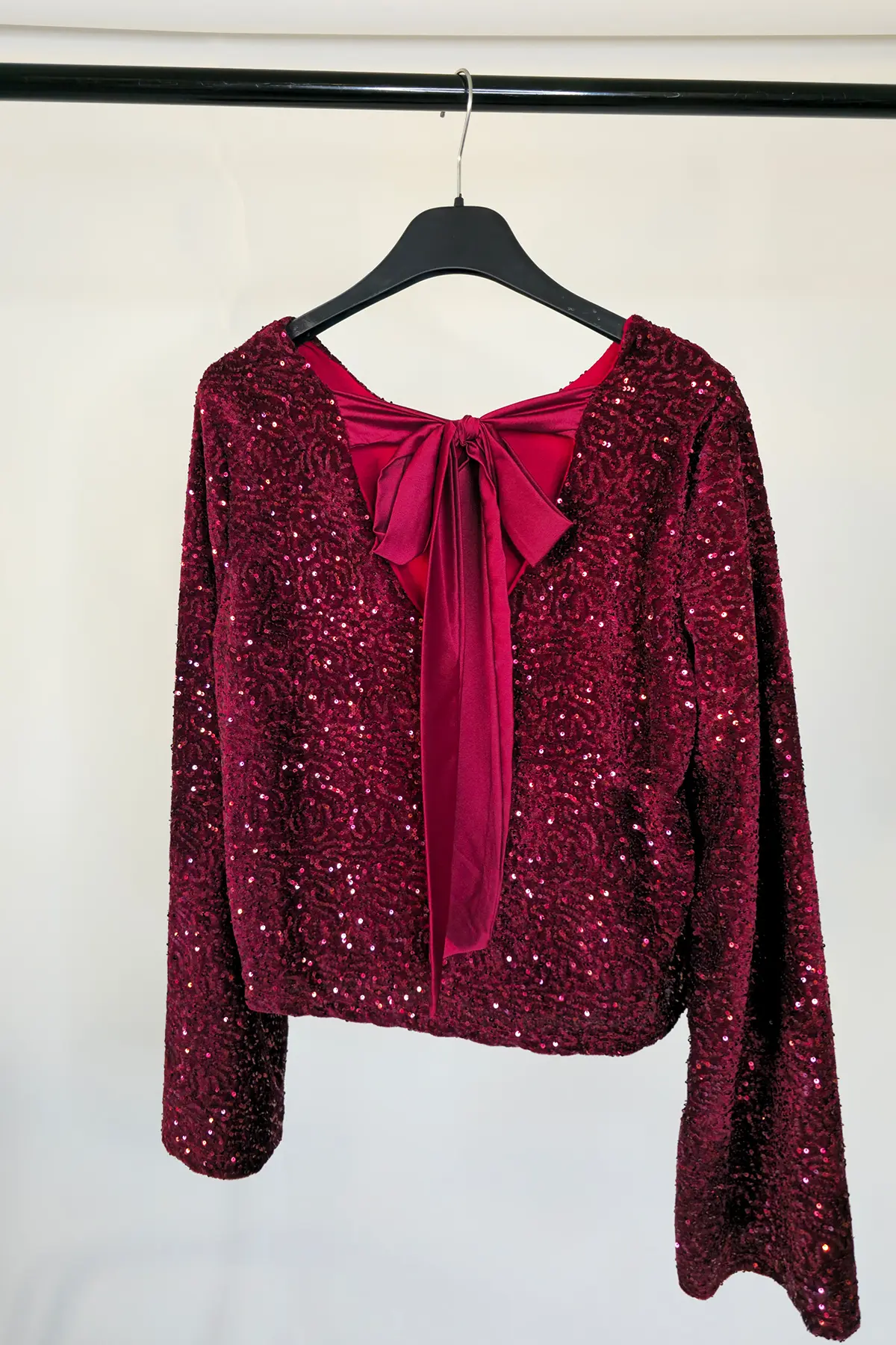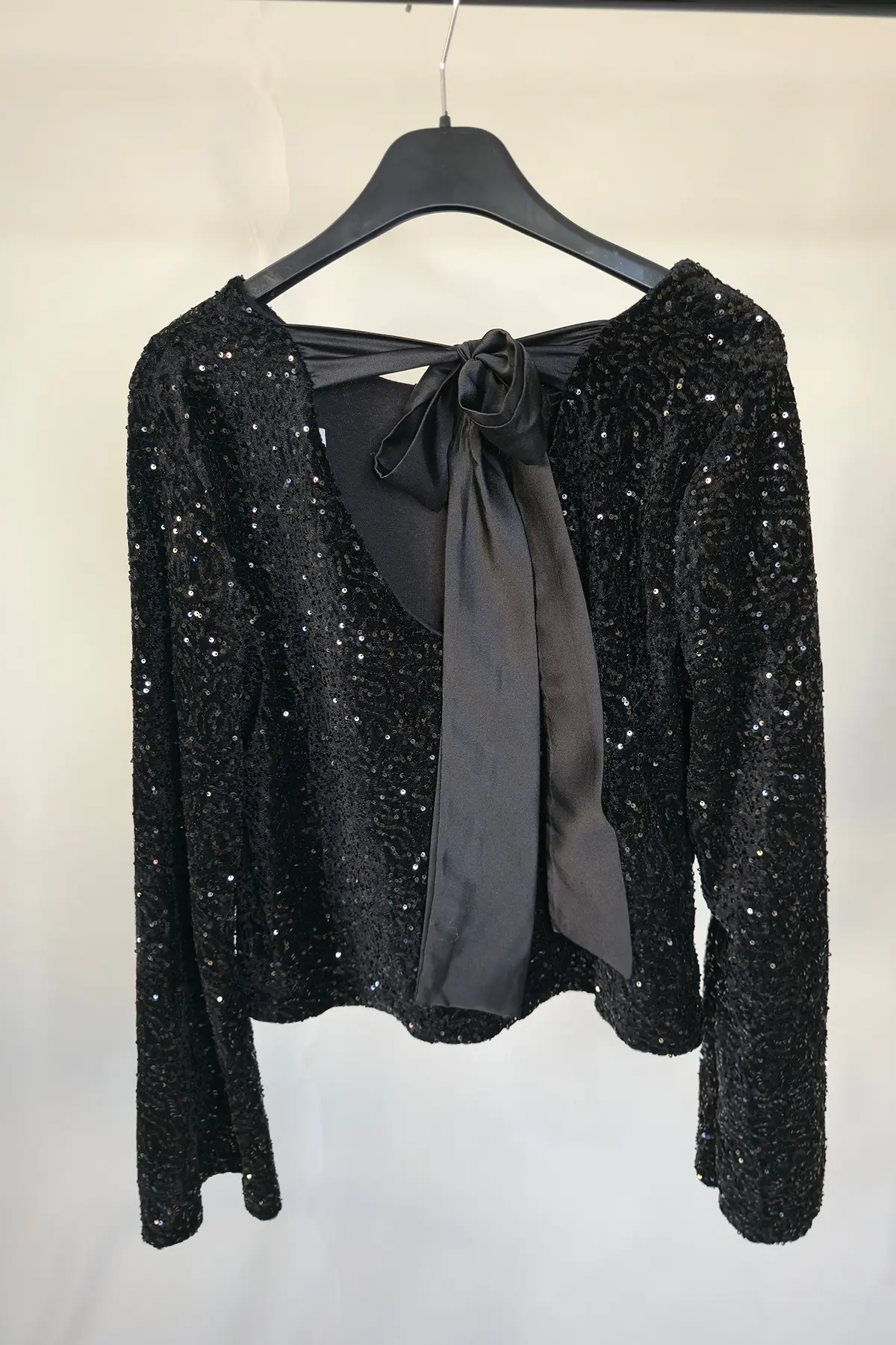 Maglia in vellutino con micropaillettes tono su tono e fiocco posteriore in raso, manica a campana.