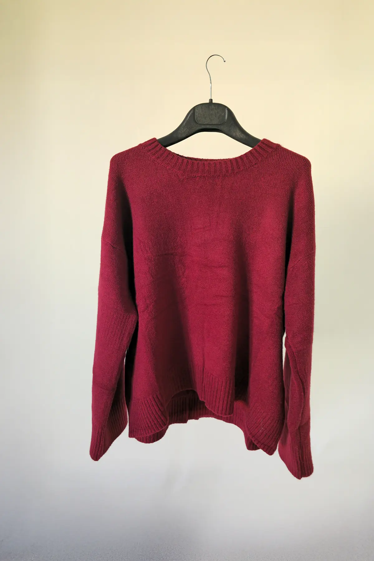Maglia dal taglio over, morbidissima con polsino a coste, più lunga sul retro.